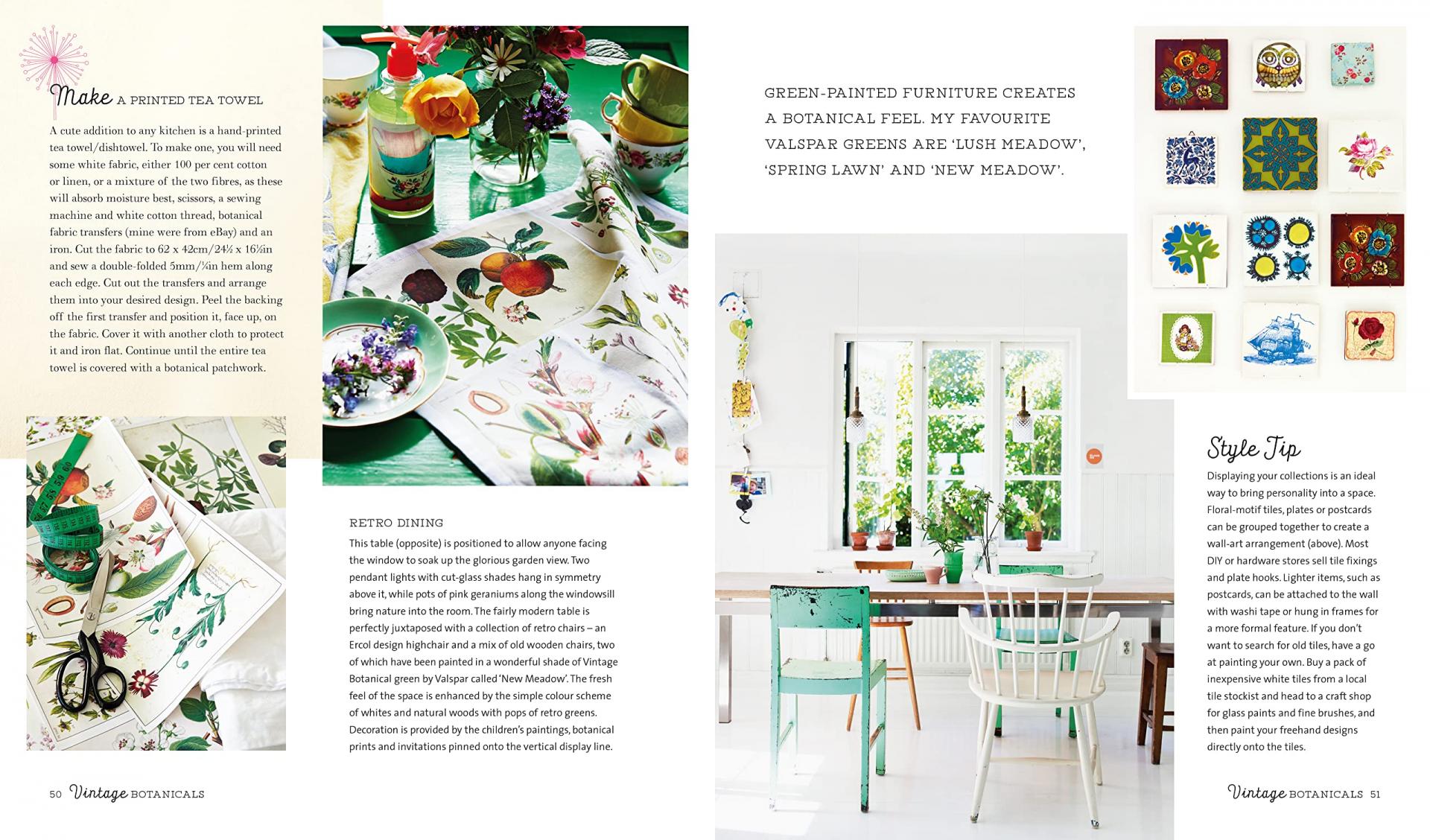 첫 번째 챕터인 식물에 대한 영감(Botanical Inspirations)에서는 가정을 변화시킬 신선한 아이디어의 원천으로 골동품 식물 프린트와 예술품, 꽃 가판대, 화분 창고, 관엽 식물 등 룩의 재료를 설명합니다. 계속해서 Selina는 스타일의 다섯 가지 측면을 탐구합니다. Vintage Botanicals는 꽃 수채화와 압화의 부드러운 팔레트를 기념하는 반면, Boho Botanicals는 정글 화분에 심은 식물과 꽃 화환으로 자유로운 1970년대 분위기를 연출합니다. Industrial Botanicals의 다양한 질감과 현대적인 매력은 광택이 나는 콘크리트, 녹슨 금속, 벗겨지는 페인트와 빈티지 과학 포스터가 있는 실험실 유리를 결합하여 현대적인 느낌을 줍니다. 다음으로 Natural Botanicals는 앤티크 프린트와 박물관 표본 케이스를 기반으로 향수를 불러일으키는 반면, Tropical Botanicals는 대담한 잎사귀 모티프, 선인장, 야자나무를 특징으로 하여 매력적인 복고풍 분위기를 연출합니다. 책 전반에 걸쳐 Selina의 DIY 메이크 및 스타일 팁은 집에서 보태니컬 스타일의 질감, 색조 및 분위기를 재현하는 방법에 대한 풍부한 제안을 제공합니다.