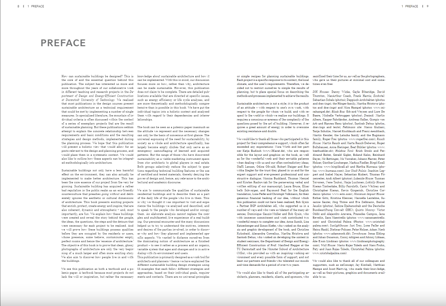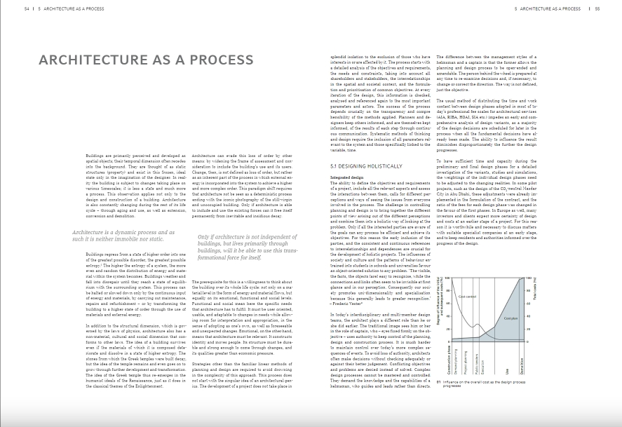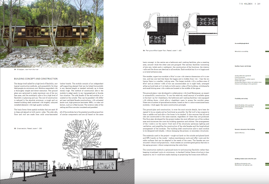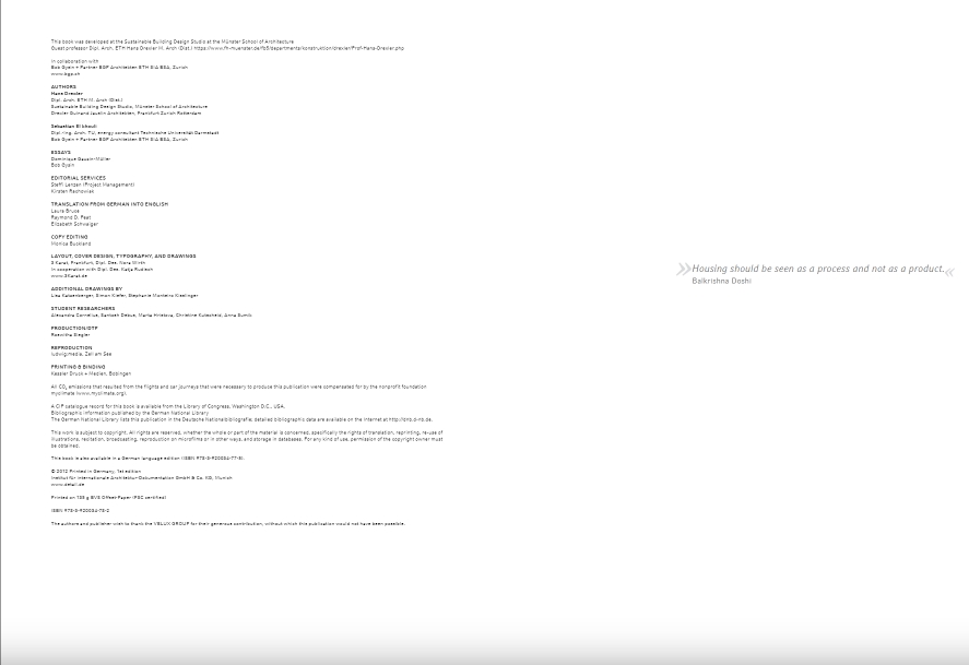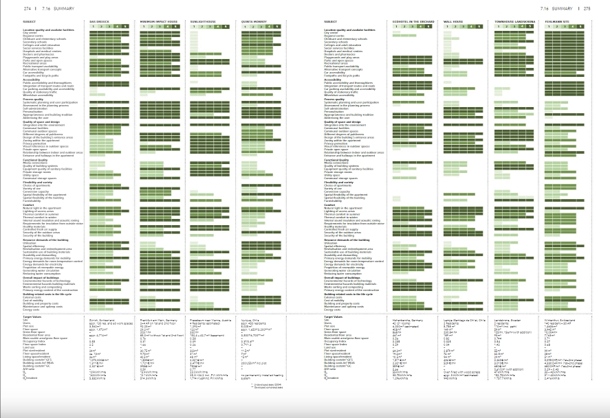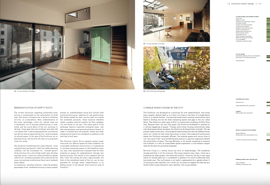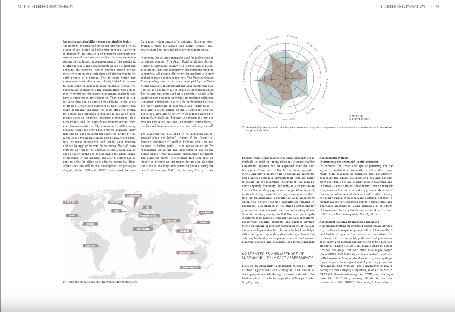 "총체적 주택. 개념, 설계 전략 및 프로세스"는 주택 건설에 대한 기본적인 참조 작업입니다. 이 책은 계획 맥락에서 지속 가능성 문제를 다루지만 건물의 '수명 주기'에 걸친 사용 및 노후화도 분석합니다. 수반되는 연구 프로젝트에서 특별히 개발된 기준 시스템을 사용하여 건물을 비교하고 평가할 수 있습니다. 또한 계획 과정에서 개발 중인 건물의 지속 가능성을 최적화하기 위한 도구로도 사용할 수 있습니다. 대조적으로, 대부분의 기존 지속 가능성 시스템은 설계 및 계획 도구가 아니라 완성된 건물 및 완성된 계획을 평가하기 위한 도구로 인식됩니다. 15개의 실제 사례는 이러한 기준과 지속 가능한 건물의 다른 측면이 정교한 건축에서 구현될 수 있는 방법과 이를 경험할 수 있는 방법을 설명합니다. 사례 분석을 통해 개발된 시스템은 건물을 분류하고 비교하는 데 사용됩니다. 생활 환경으로서 건물의 중요성도 여기에서 간과되지 않습니다. 지속 가능성은 주거 용도에 중점을 두고 건물과 사용자 간의 대화에서 발전합니다.