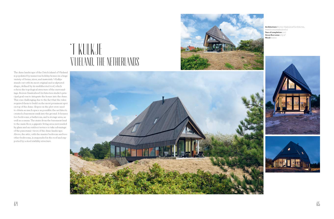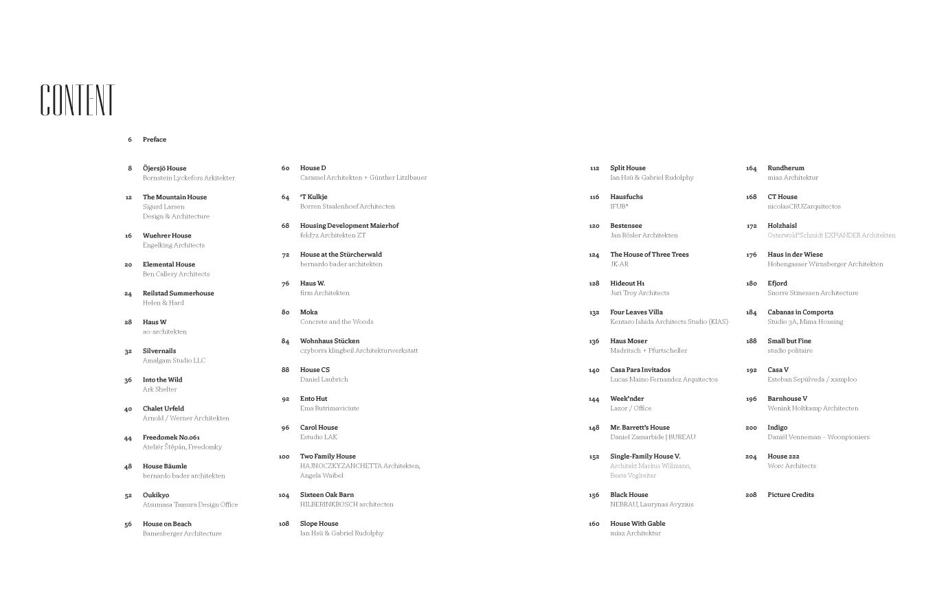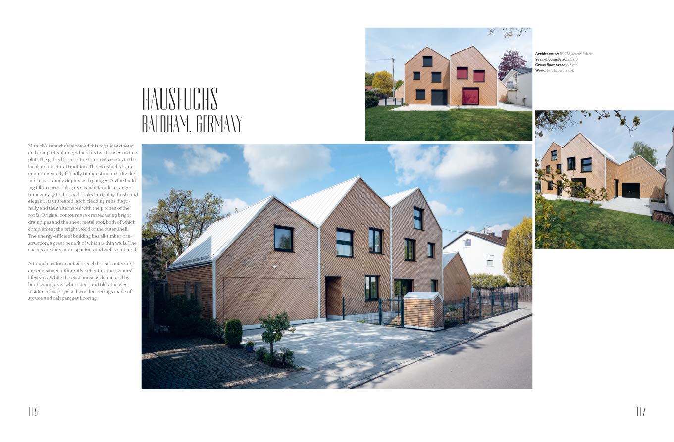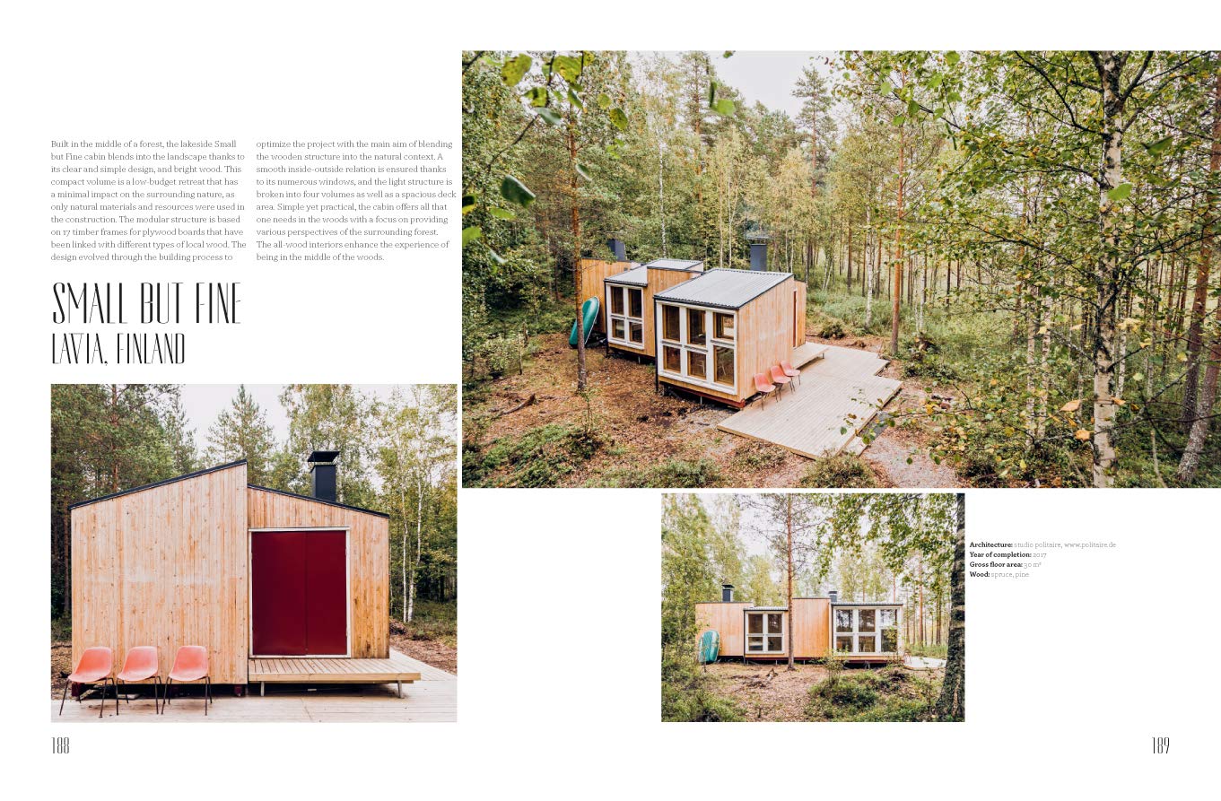 미래 및 트렌드 연구원인 Matthias Horx가 "Wood is Style"이라고 요약한 것처럼 wood는 상당한 이미지 변화를 겪고 있습니다. 전통적이고 소박한 구석에서 벗어나 첨단 건축자재의 정상을 향해 나아갔습니다. 혁신적인 목재 건축 기술은 잘 알려진 생태학적 측면과 건축 생물학적인 측면뿐만 아니라 설계의 자유를 크게 보장하고, 매우 정밀하며, 동시에 매우 대담한 건축에도 보온성과 포근함을 제공합니다. 금속, 유리, 벽돌 또는 노출 콘크리트와 같은 다른 재료와 조합하거나 대조적으로 목재를 사용하는 것은 건축가와 디자이너가 디자인을 위해 점점 더 많이 선택하는 옵션입니다. 설계자들의 실험 의지는 목조 주택과 내부 색채 구성에서도 뚜렷하게 드러납니다. 본 출판물은 미국과 캐나다를 포함한 전 세계의 주거용 건물에 대한 독특한 개요를 제공하며 건축가와 인테리어 디자이너, 건축업자들에게 현대 목재 건축의 다양성을 소개합니다.